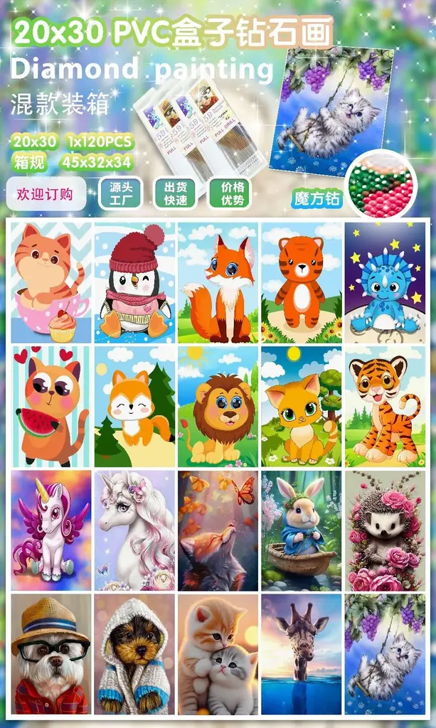 Chinese name: 卡通动物PVC盒钻石画(混款)23*30