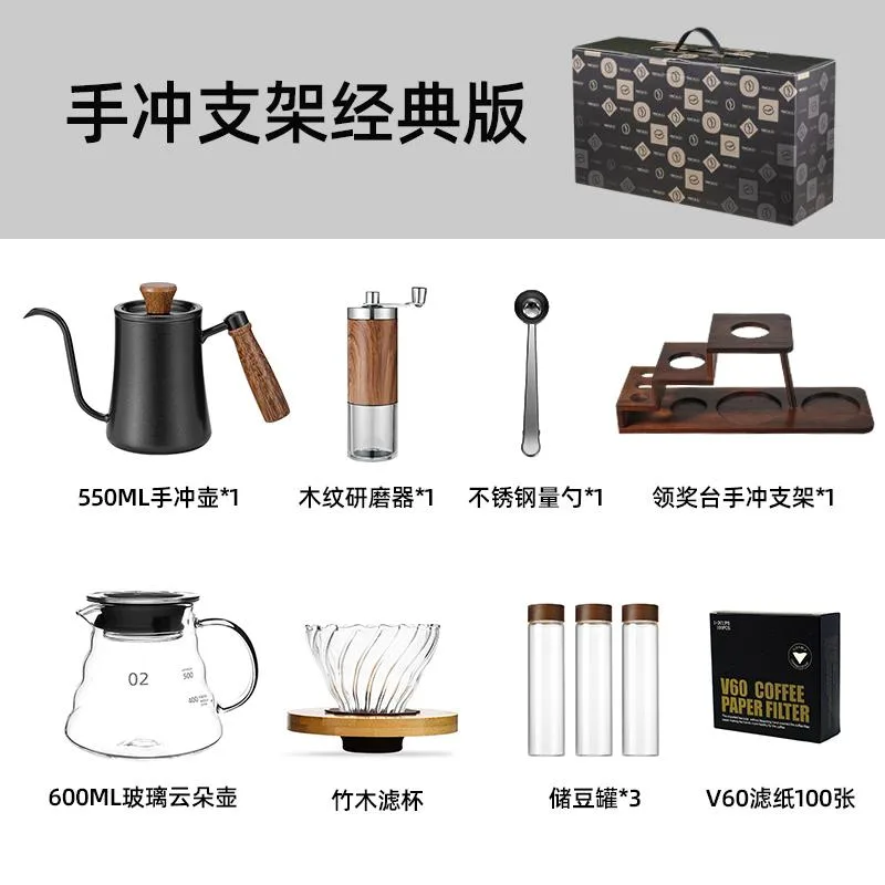 Overview: A premium pour-over coffee set presented on a wooden stand with black accessories.