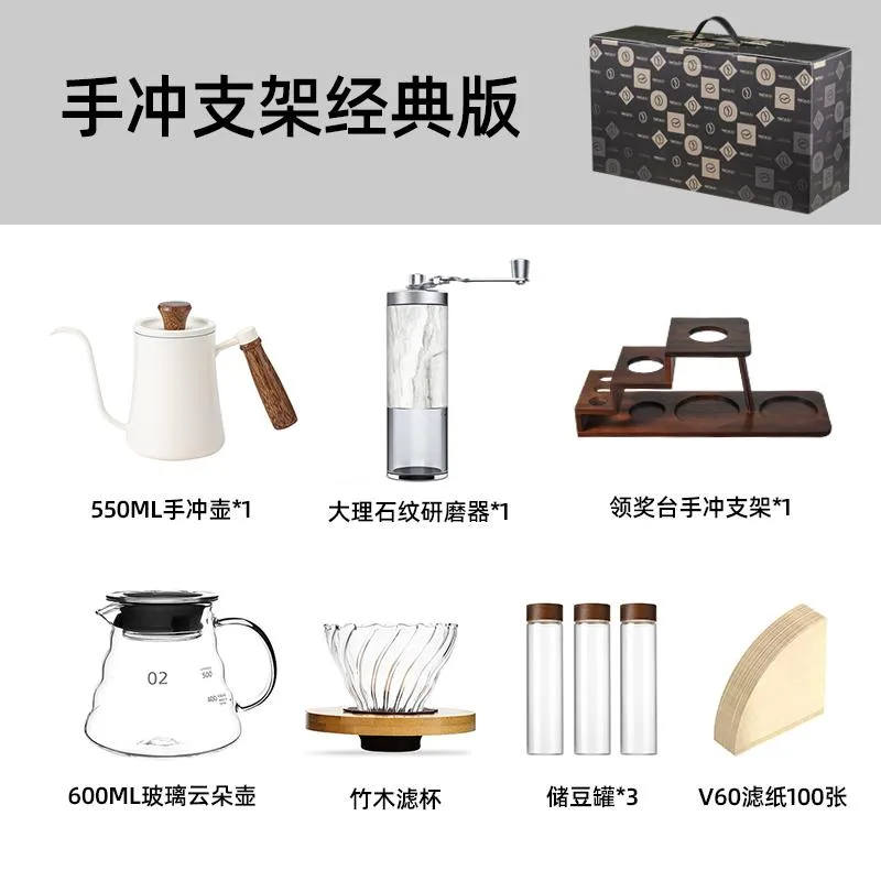 Overview: A premium pour-over coffee set presented on a wooden stand with white ceramic accessories.